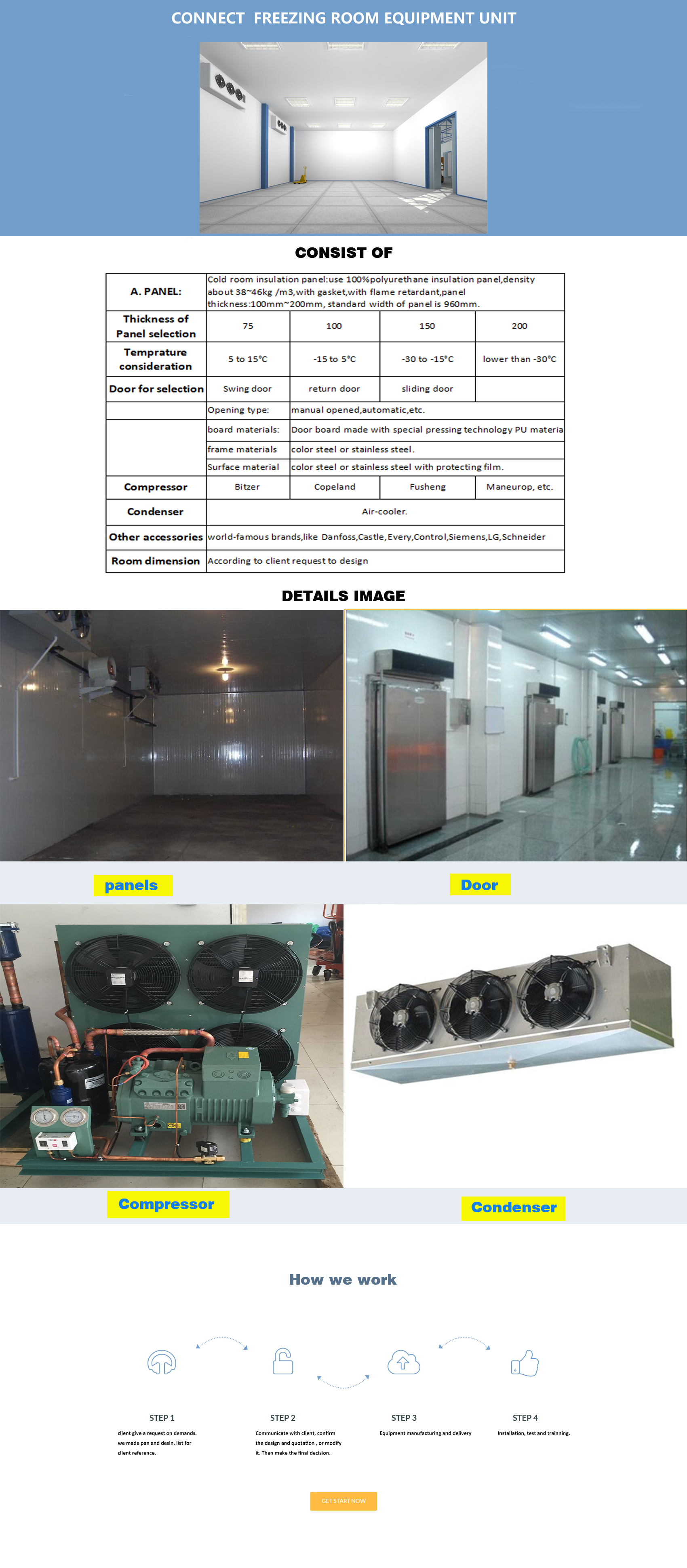 The air-cooled unit is the preferred form of small cold storage, which has the advantages of simplicity, compactness, easy installation, convenient operation, and less auxiliary equipment. This kind of refrigeration equipment is also relatively easy to see. The refrigerator of the refrigeration unit is the heart of the refrigeration equipment. Common compression refrigerators are divided into open type, semi-closed type and fully closed type. The fully enclosed compressor has small size, low noise, low power consumption, high efficiency and energy saving. It is the first choice for small refrigerators. It is an air-cooled refrigeration unit mainly composed of a fully enclosed compressor. It can be made into a form like a split air conditioner and mounted on the wall. The best fully enclosed refrigeration compressors on the market are imported from developed countries or sino-foreign joint venture refrigeration equipment products are more reliable in quality, but the price is more than 50% higher than that of domestic compressors, which is more suitable for small urban cold storage refrigeration equipment. Design points of small-scale cold storage Small-scale prefabricated cold storage with cold storage temperature below 0 degrees (-16 degrees) needs to set up 10# channel steel overhead on the ground (under the storage board) to make it naturally ventilated. There are two common construction methods for cold storage projects, one is the prefabricated cold storage project, and the other is the civil cold storage project. Most of the civil cold storage projects use PU polyurethane spray foam as the thermal insulation storage board. The selection of refrigeration equipment for cold storage projects mostly uses Freon refrigeration units, large cold storages are mostly water-cooled, and small cold storages are multi-purpose air-cooled units; imported German Bitzer cold storage refrigeration units and French Miyule units, running smoothly, low energy consumption, low failure rate , is the preferred unit for cold storage. It is very important to pay attention to whether the refrigeration equipment of the cold storage project is reasonably configured. This is because a Refrigerating Unit with reasonable matching and reliable performance can not only meet the refrigerating capacity of the cold storage required by the product and the requirements of the storage refrigeration process, but also save energy and have a low failure rate. Some enterprises and individuals who want to build cold storages blindly pursue low prices, ignoring whether the matching of cold storage equipment is reasonable, resulting in the failure to achieve the cooling effect after use. Reasonable setting and matching of refrigeration equipment for cold storage projects may increase investment when building cold storage, but in the long run, it saves a lot of money and effort. The after-sales service of cold storage equipment is also very important, as is the operation and maintenance of cold storage equipment and technical services. The vast number of warehouse construction enterprises should investigate various aspects before building a cold storage, listen to the opinions of other enterprises on the configuration of cold storage refrigeration equipment, and finally determine a practical cold storage plan. Build your own cold storage with a high starting point and high standards, and strive for the best benefits for yourself.